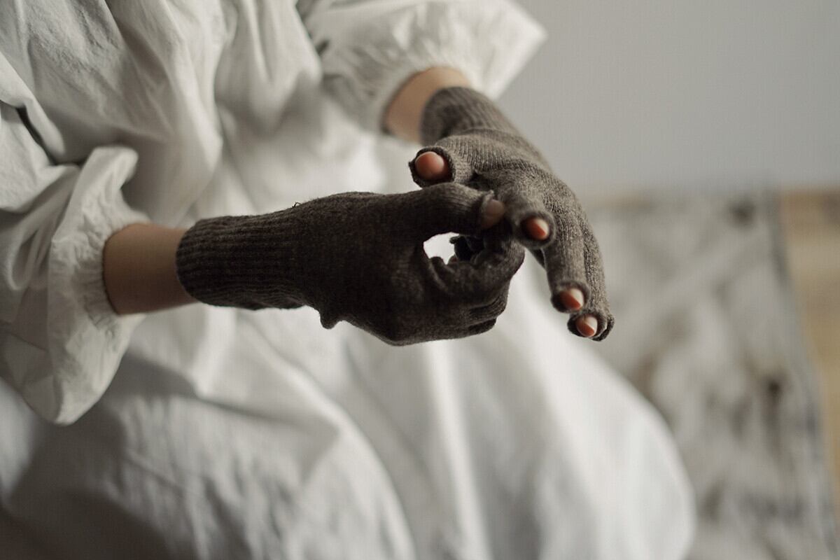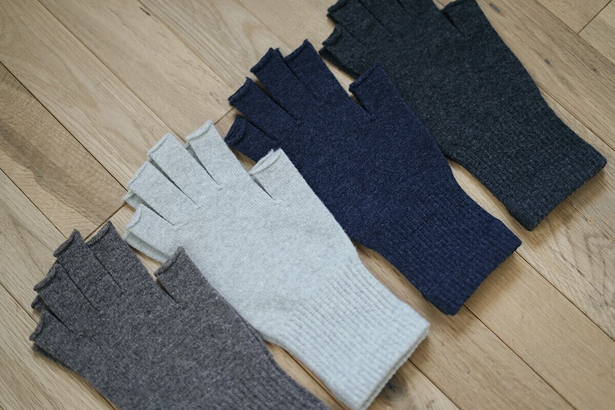カシミヤと同じくらい細やかなウールを使用したしっとりと温かい指先フリーの手袋です。薄手なのにかさ高く、ふわふわと柔らかな風合いです。指先まで生地があるので、手首から指先まで温めてくれます。
